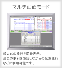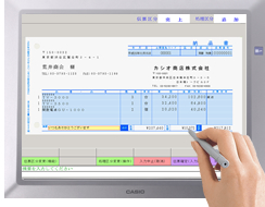 | 伝票イメージをそのまま表示、使い慣れた伝票に直接入力する感覚で業務を行うことができます。また、ディスプレイ部にタッチパネル液晶を搭載、専用ペンを使って画面に直接入力することも可能です。各業務アプリケーションとの連動により、今までの業務の流れを変えずに、スムースな事務処理をサポートします。 | |